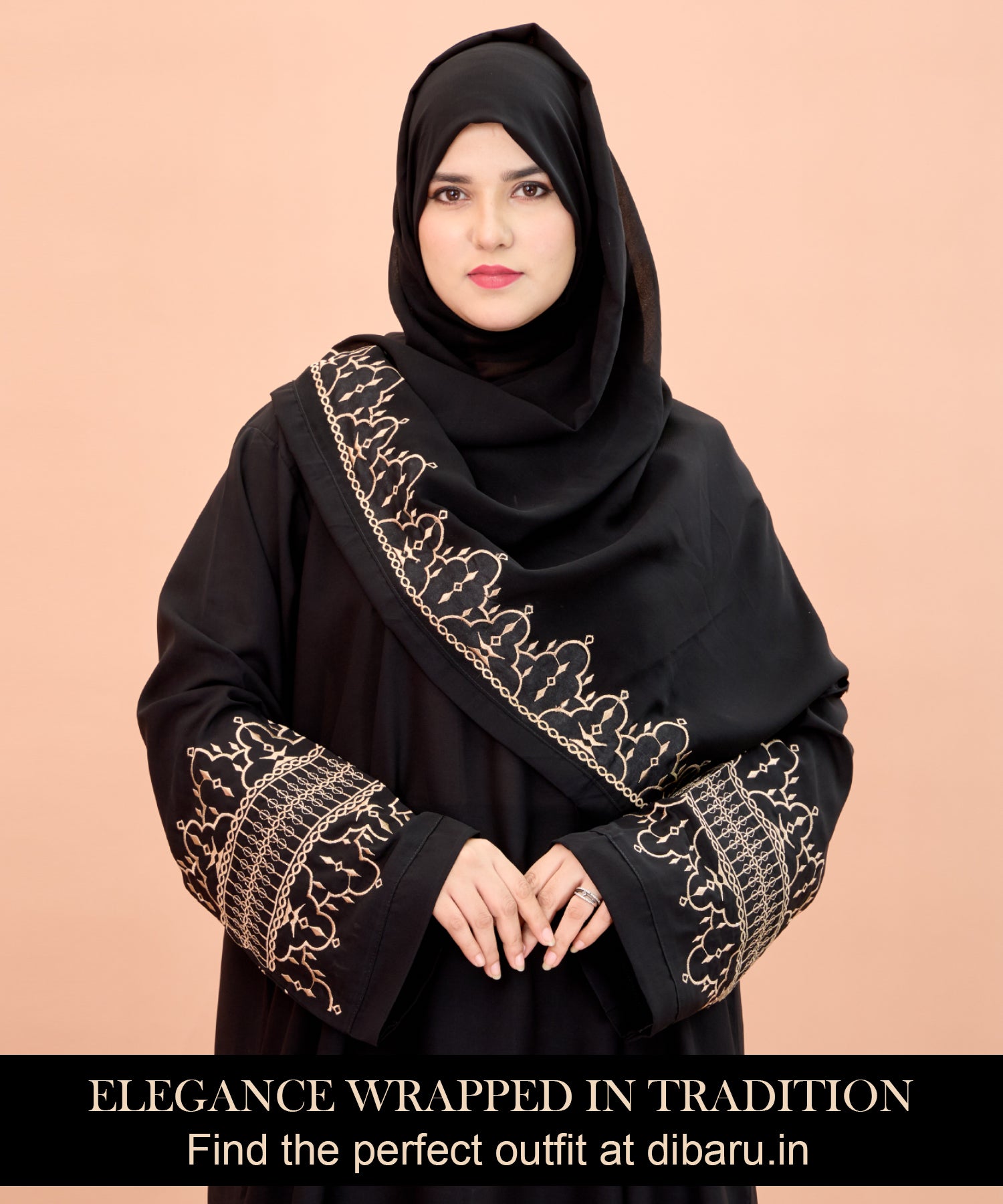 V Neck Arrow Patti Gold Design With Plazo Sleeves Made Up Of Imported Nida Fabric Full Lenght Designer Abaya For Womens And Girls